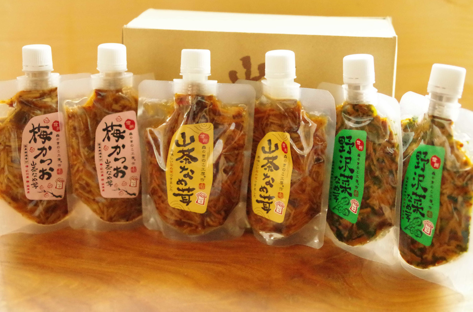 山茶なめ茸、梅かつお、野沢菜の3種類の味のなめ茸を4パックずつ詰め合わせました。その日の気分によって味を選んでみてはいかがでしょうか?